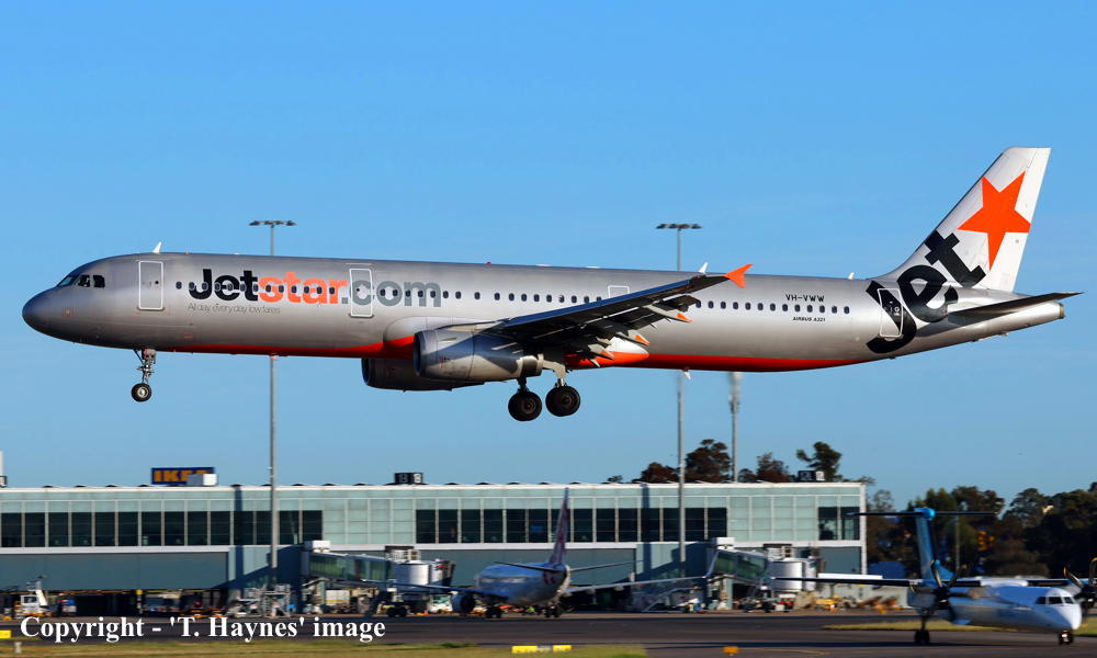 VH-VWW. Jetstar - in the standard livery at Sydney Kingsford Smith Airport, November 19, 2016. (T. Haynes Copyright Image 0320-792.) |