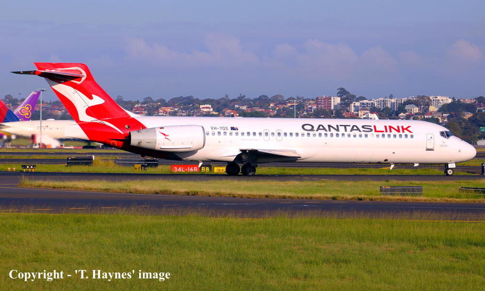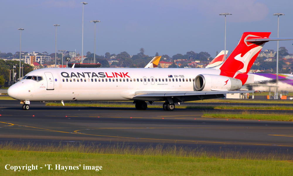 VH-YQS. QantasLink - in the 'New Roo' livery at Sydney Kingsford Smith Airport, March 11, 2014. (T. Haynes Copyright Image 4660-605.) |