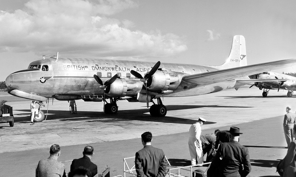 VH-BPH. British Commonwealth Pacific Airlines - 'RMA Discovery' in the standard livery at Auckland Whenuapai Airport, October 10, 1952. (R. N. Smith Collection via Whites Aviation WA-31166-F Copyright Image 1125-605.) |