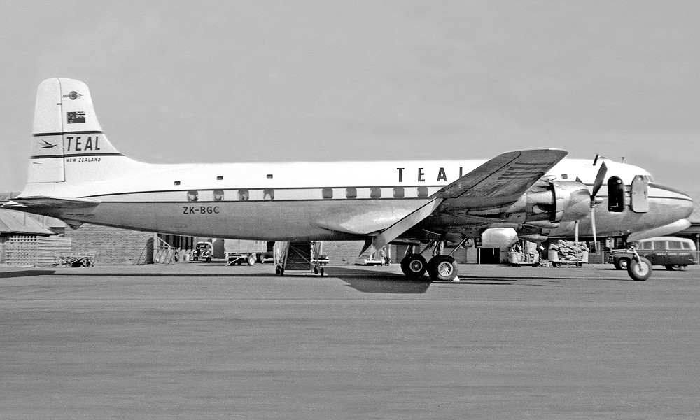 ZK-BGC. T.E.A.L. - 'Arahia' in the original livery at Sydney Kingsford Smith Airport, date unknown.