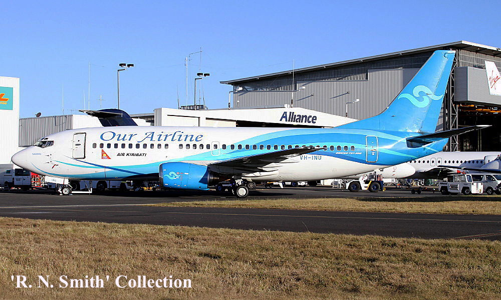 On This Day - March 22, 2011. The Our Airline Boeing 737-3YO VH-INU 'Naoero' was observed at Brisbane with additional 'Air Kiribati' titles and logo on the forward fuselage. |