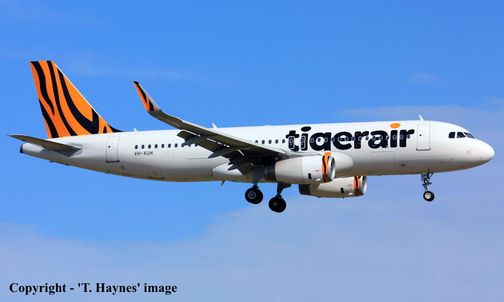 VH-XUH. Tigerair - in the standard livery at Sydney Kingsford Smith Airport, February 01, 2016. (T. Haynes Copyright Image 0320-561.) |