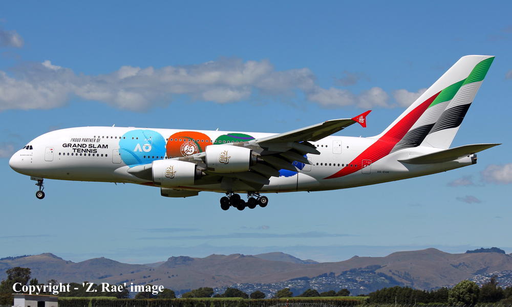 A6-EUH. Emirates - in the special 'Grand Slam Tennis' livery at Christchurch Airport, February 19, 2026.