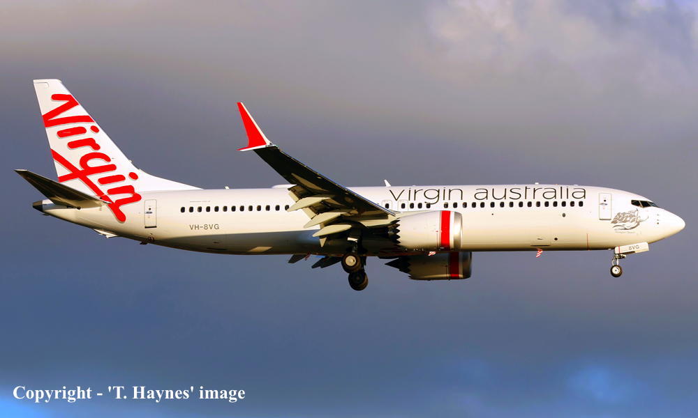 This aircraft was ordered new by Virgin Australia Pty Ltd - 2023 It was the 15th Boeing 737-8 MAX ordered by Virgin Australia The aircraft was built by the Boeing Company, Renton, Washington, U.S.A. Powered by CFM International CFMI LEAP-1B25 engines Entered onto the Australian Aircraft Register as VH-8VG - January 08, 2026 Registered to CIT Aerospace LLC, Dublin, Ireland Leased to Virgin Australia Airlines Pty Ltd, Spring Hill, Queensland as the registered operator It was observed at Seattle (Renton) in the 'Virgin Australia' livery - January 26, 2026 First flown (T1) Seattle (Renton - 12:59 UTC) - Seattle (Boeing Field - 15:18 UTC) as BOE024 - February 03, 2026 Test flown (T2) Seattle (Boeing Field - 09:55 UTC) - Seattle (Boeing Field - 12:39 UTC) as BOE024 - February 18, 2026 Test flown (C1) Seattle (Boeing Field - 14:38 UTC) - Seattle (Boeing Field - 15:10 UTC) as BOE024 - February 18, 2026 Accepted by Virgin Australia at Seattle (Boeing Field) - February 23, 2026 Ferried Seattle (Boeing Field) - Orlando (Florida) as VA9946 - February 23, 2026 The aircraft's 'wi-fi' system was installed at Orlando International, Florida Registered to CIT Aerospace LLC, Dublin, Ireland - February 27, 2026 Leased to Virgin Australia Airlines Pty Ltd, Spring Hill, Queensland as the registered operator It departed Orlando ( 08:01 local) on the delivery flight to Australia as VA9947 - March 01, 2026 It arrived at Brisbane (13:39 AEST) on completion of the delivery flight from the United States - March 03, 2026 Delivery route: Seattle (Boeing Field) - Orlando (Florida) - Ontario (California) - Kona (Hawaii) - Brisbane The aircraft was named 'Peregian Beach' Operated its first revenue service Brisbane - Sydney (Kingsford Smith) as VA946 - March 08, 2026 Current with Virgin Australia Airlines |