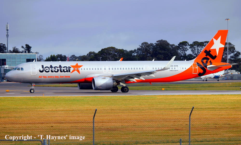 VH-OYR. Jetstar - in the revised livery at Adelaide West Beach Airport, March 23, 2025. (T. Haynes Copyright Image 0321-632.) |