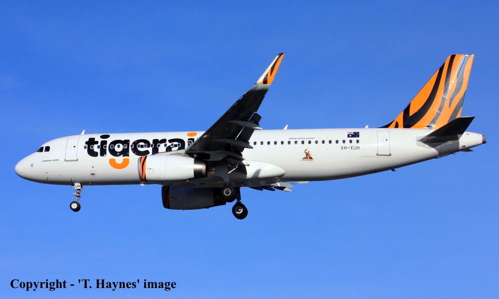 VH-XUH. Tigerair - in the standard livery at Sydney Kingsford Smith Airport, February 01, 2016. (T. Haynes Copyright Image 0320-561.) |