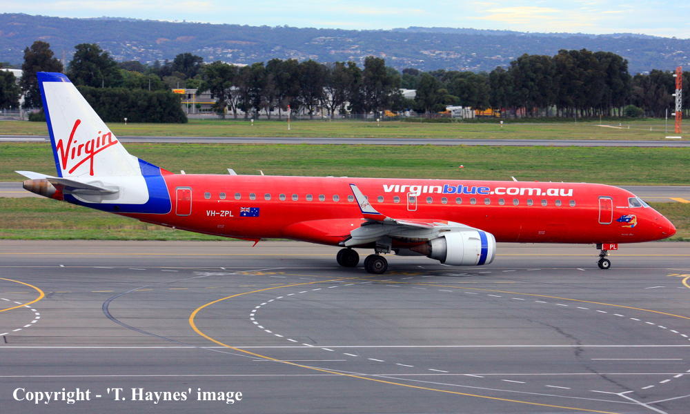 VH-ZPL. Virgin Blue - 'Samba Blue' in the standard livery at Perth Airport, March 17, 2010. (R. Shaw Copyright Image 0190-031.) |