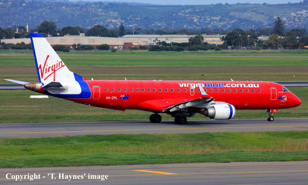 VH-ZPL. Virgin Blue - 'Samba Blue' in the standard livery at Adelaide West Beach Airport, June 09, 2014. (T. Haynes Copyright Image 0190-607.) |