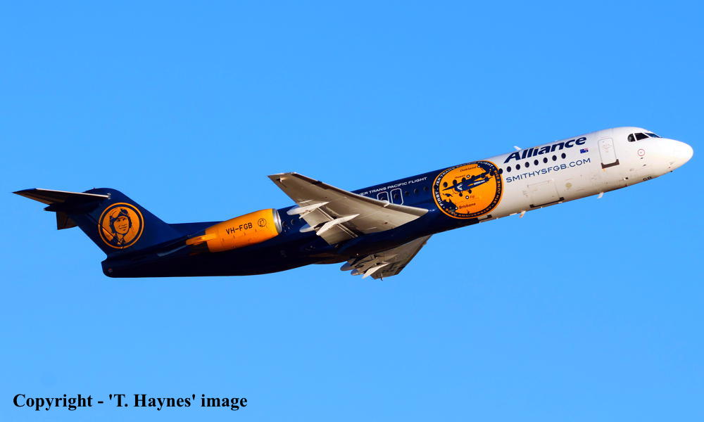 VH-FGB. Alliance - in the special livery with '90th Anniversary First Ever Trans Pacific Flight' titles at Perth Airport, June 12, 2018. (D. Gibbs Copyright Image 1995-920.) |