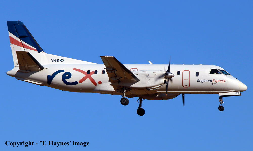 This aircraft was built by Saab Aircraft AB, Linkoping, Sweden - 1992 First flown with test registration 'SE-G90' - February 02, 1992 Sold to Lambert Leasing Inc, Sterling, Virginia - March 24, 1992 Entered onto the United States Aircraft Register as N361BE - March 24, 1992 Registered to Lambert Leasing Inc Leased to Business Express, New York as the registered operator Sold to Grant Holdings Inc, U. S. A. - July 29, 1992 The lease to Business Express was continued Business Express was renamed Business Express Airlines - May 22, 1997 Withdrawn from use and stored at Nashville (Tennessee) - December 2000 Returned to the lessor - June 2001 It was observed stored at Nashville (Tennessee) in the 'Business Express' livery - July 27, 2003 Departed Nashville on the delivery flight to Australia - March 26, 2004 It arrived at Wagga Wagga (N.S.W.) on completion of the delivery flight from the United States - March 31, 2004 Ferry route: Nashville - Long Beach - Honolulu - Nadi - Coolangatta - Orange - Wagga Wagga Cancelled from the United States Aircraft Register - April 22, 2004 Entered onto the Australian Aircraft Register as VH-KRX - April 23, 2004 Registered to Australiawide Airlines, Wagga Wagga, Australia t/a REX Regional Express Airlines Operated its first revenue service - ? Registered to Regional Express Holdings Ltd, Mascot, Sydney - October 27, 2008 Current with Regional Express Airlines |