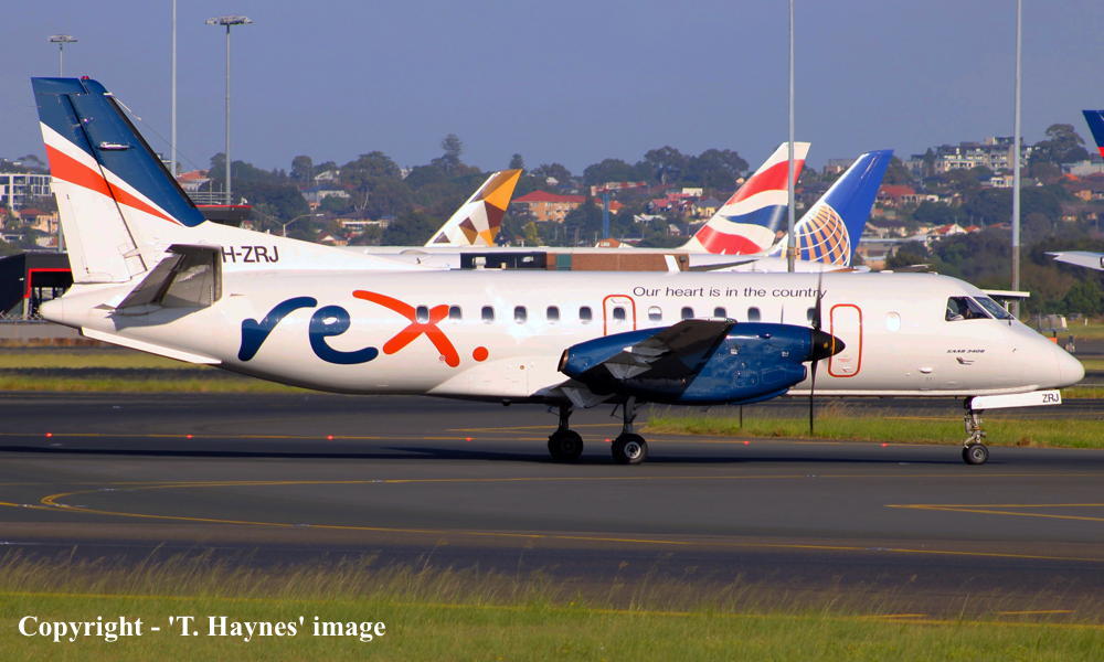 VH-ZRJ. REX Regional Express - in the standard livery at Sydney Kingsford Smith Airport, March 29, 2024. (T. Haynes Copyright Image 1045-319.) |